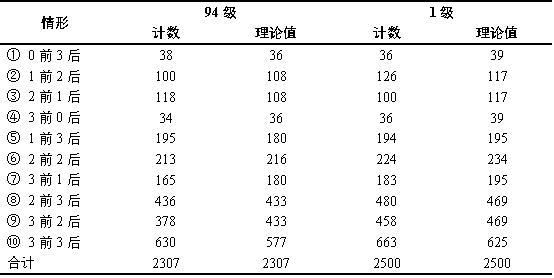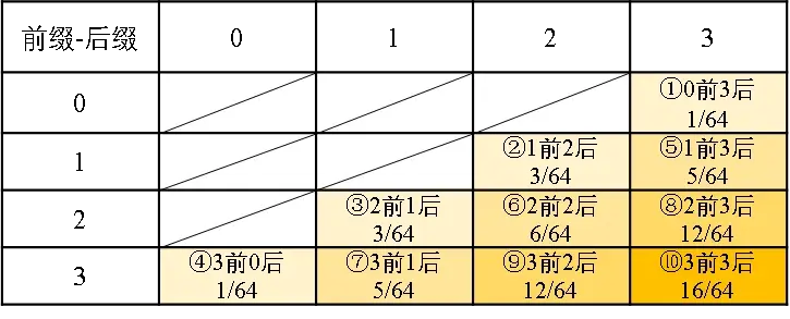 对于表1给出的10种情况,6词缀有且只有一种情况⑩,即16/64=2/8=1/4无需讨论;5词缀有两种情况⑧⑨,为对称关系,很容易理解3/8/2=3/16=12/64。