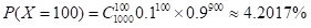 以赌博买到亮金戒指概率为0.1为例,那么买1000个戒指,数学期望自然是E=np=100,那么获得100个亮金戒指的概率如何呢?
