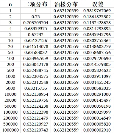 进一步可以求出,二者的误差仅为0.00015,可以说,此时使用泊松分布是很方便了。