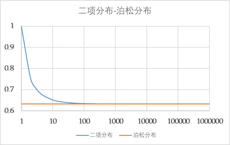 我们知道,根据两个重要极限之一自然对数的底数e的定义,由于小概率事件前提“p趋向于0”,那么式7可以进一步变形为:
