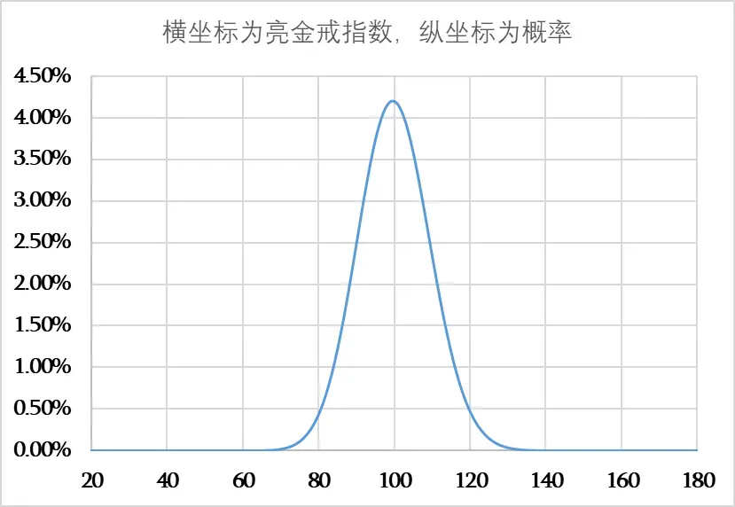 就很高,所以概率并不预测每一次的具体结果,但是可以告诉我们大概率发生的事件是什么,也就是说如果我们买1000个戒指,获得80-120亮金戒指的概率高达97%,虽然看起来没什么用,但我们可以知道,想要人品爆炸,买出150个,200个亮金戒指或者人品败尽只有三五十个也都是几近不可能的。如果用图像表示,那么就是这样: